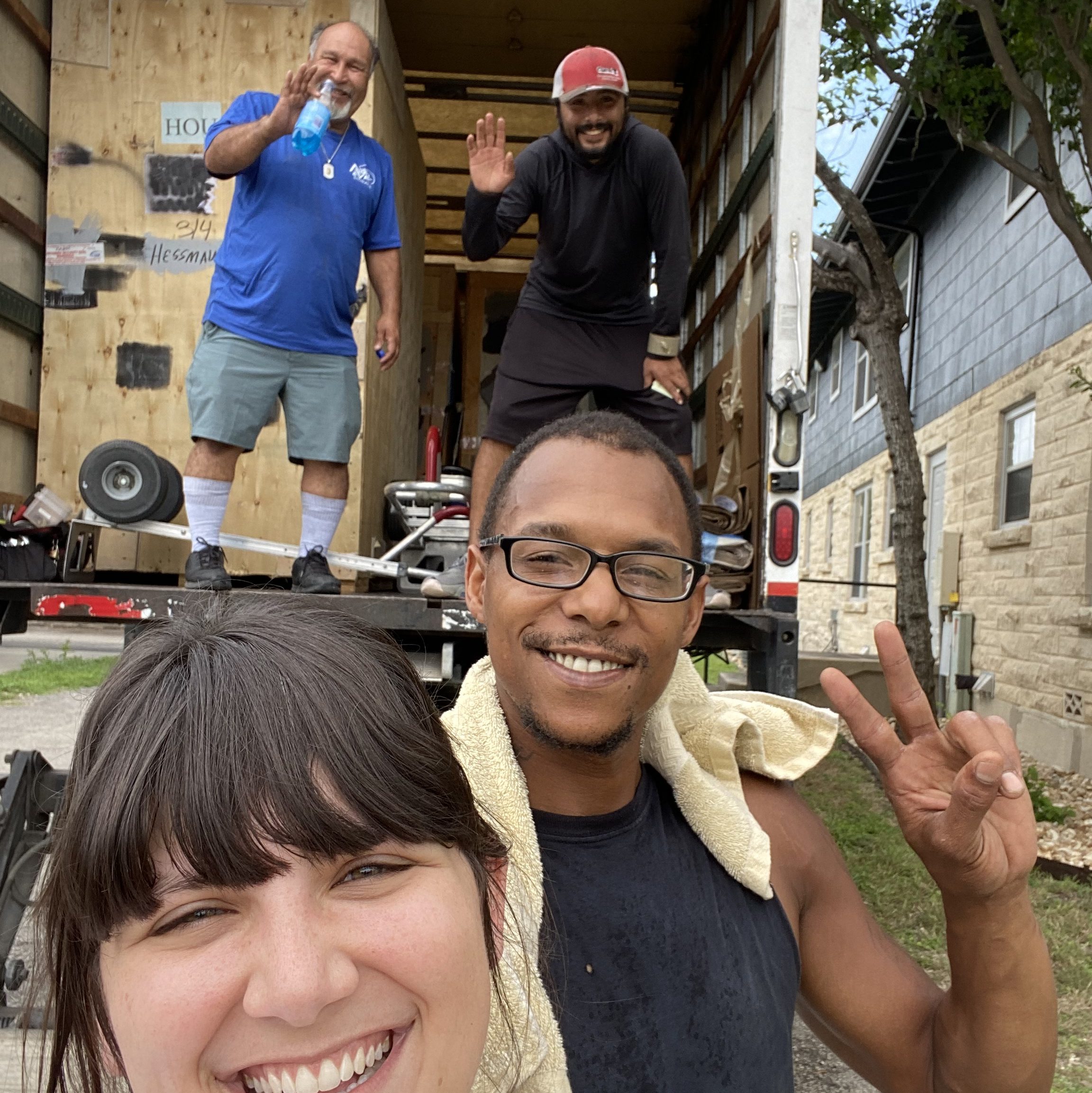 The movers came around 9:30, after a serious debacle with the moving company where they tried to postpone my move by an entire week. Gasp! After sprinkling some light, “can I speak to the manager?” energy onto the situation, they were able to move things around and make sure I got out in time. Since I already sold my car, turned my internet off, gave my apartment a departure date, scheduled termination of services with the electric company, and had my mom drive to San Antonio to pick me up, this was good news. Another thing about moving: it rarely goes perfectly to plan. Luckily, everything worked out and we were able to clear out. Here I am with the movers: